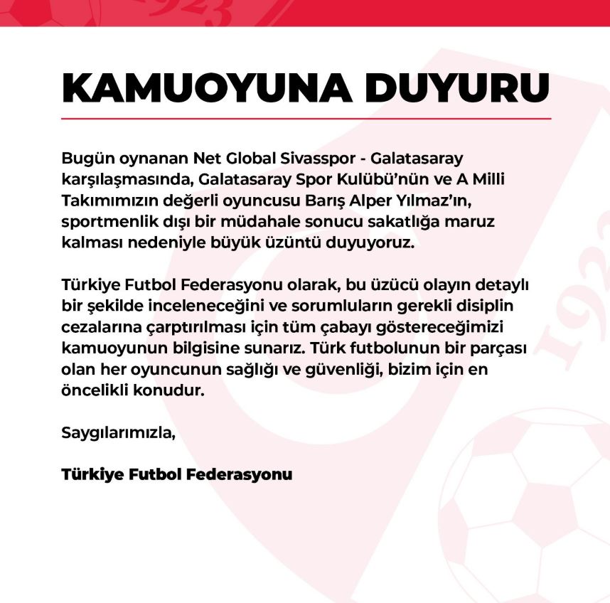 "Bugün oynanan Net Global Sivasspor-Galatasaray karşılaşmasında, Galatasaray Spor Kulübü’nün ve A Milli Takımımızın değerli oyuncusu Barış Alper Yılmaz’ın, sportmenlik dışı bir müdahale sonucu sakatlığa maruz kalması nedeniyle büyük üzüntü duyuyoruz."