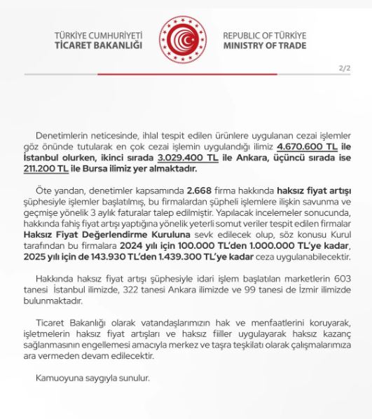 Öte yandan, denetimler kapsamında 2.668 firma hakkında haksız fiyat artışı şüphesiyle işlemler başlatılmış, bu firmalardan şüpheli işlemlere ilişkin savunma ve geçmişe yönelik 3 aylık faturalar talep edilmiştir.
