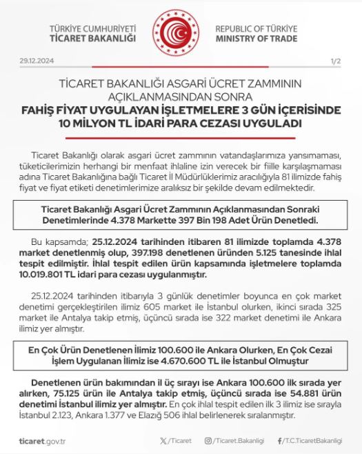Ticaret Bakanlığı, asgari ücret zammının açıklanmasından sonra fahiş fiyat uygulayan işletmelere 3 gün içerisinde 10 milyon TL idari para cezası uyguladı.