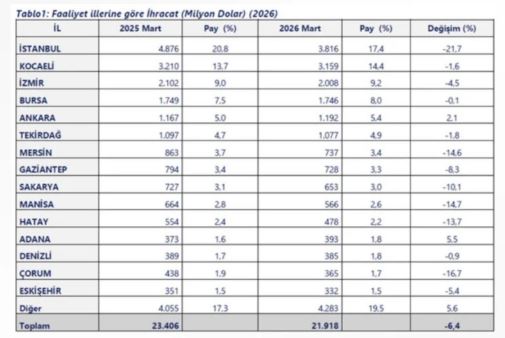 Bakanlık verilerine göre, yılın ilk üç ayında Türkiye genelinde 40 il ihracatını artırırken, 14 ilde 1 milyar doların üzerinde ihracat gerçekleştirildi. Ancak Körfez bölgesinde devam eden savaşın etkisiyle toplam ihracatta düşüş yaşandı.