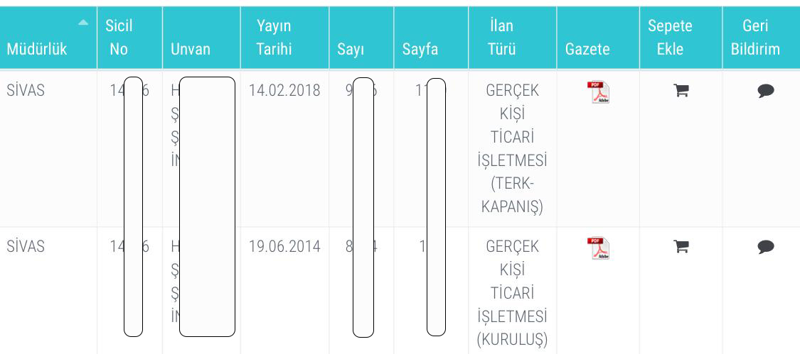 Örneğin bir işletmenin ne zaman kurulduğu veya bir işletmenin ne zaman kapandığı aşağıdaki örnek görselde ki gibi her an herkese açık şekilde ilan edilir...