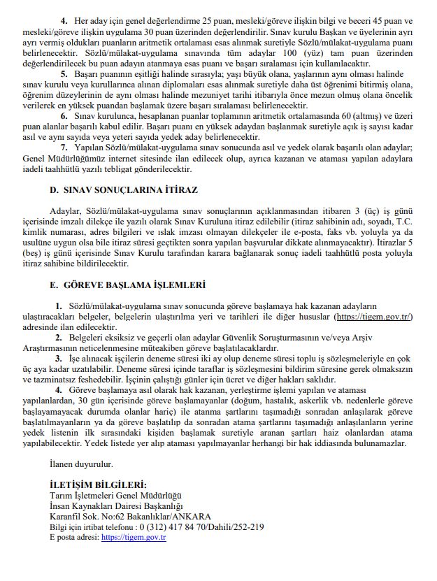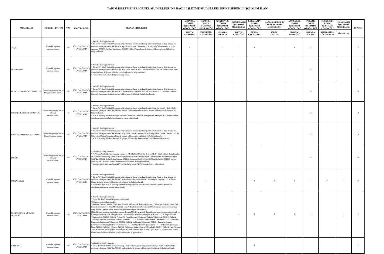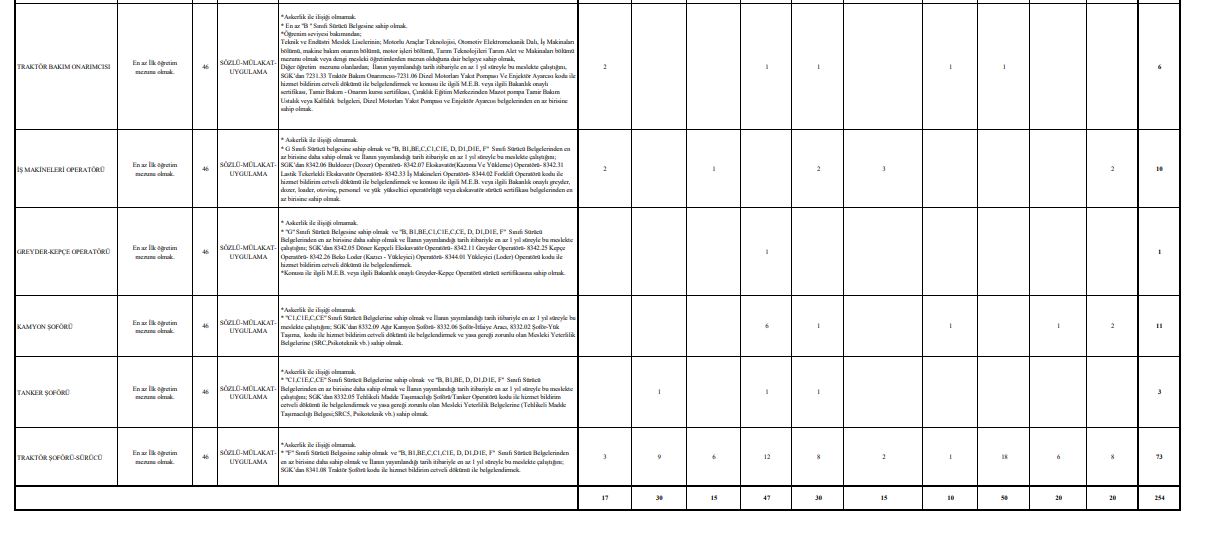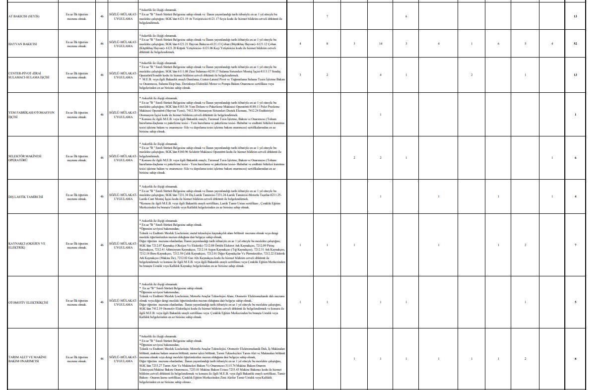 En fazla alım yapılacak kadrolar arasında 73 traktör şoförü, 52 hayvan bakıcısı, 13 at bakıcısı (seyis) ve 13 zirai sulamacı bulunuyor. Bunun yanı sıra farklı alanlarda da işçi alımları yapılacağı bildirildi.