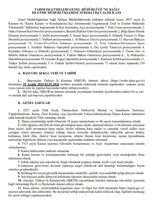 TİGEM, 4857 sayılı İş Kanunu kapsamında farklı işletmelerinde görevlendirilmek üzere 254 sürekli işçi alımı gerçekleştirecek. Alımlar, Türkiye genelinde 8 farklı ilde yapılacak olup, bu kapsamda Sivas’ın Ulaş ilçesinde faaliyet gösteren TİGEM işletmesine de 20 personel alınacak.