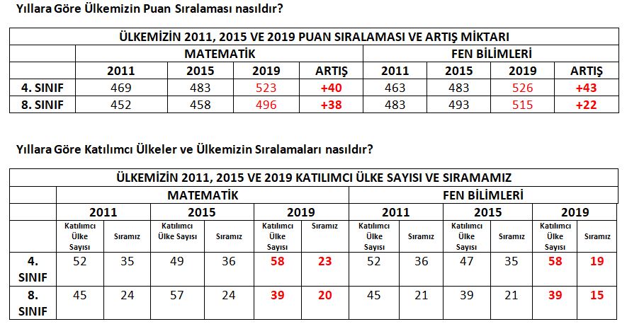 Sonuç olarak, ülkemiz matematik ve fen değerlendirmelerinde ortalama başarısını anlamlı ölçüde artırmıştır. Ülkemiz ilk kez ölçek orta noktasına ulaşan bir performans göstermiştir. Bu başarının yakalanmasında özveriyle bu işin mutfağında çalışan öğretmen, yönetici, öğrenci ve velilerimizi tebrik ediyorum. Mevcut koşullarımızın iyileşmesi için çalışanlara ülkemiz adına şükranlarımı sunuyorum.