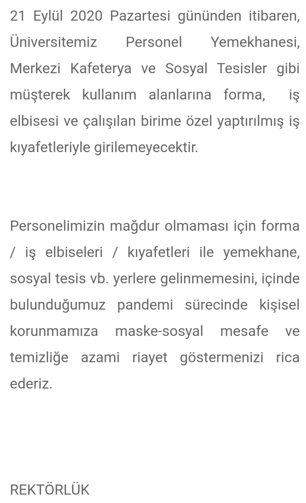 "Cumhuriyet Üniversitesi rektörlüğü artık sağlık çalışanlarına yemeği de çok görmeye başladı. Yazıda belirtilen ekipmanları giyenlerin tamamına yakını sağlık personelidir. Birçok sağlık çalışanı bu elbiseleri ile hastaneye gelip gitmektedir.