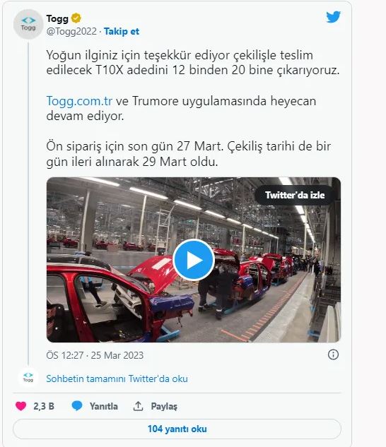 Togg son yaptığı açıklamayla 12 bin olan teslim edilecek araç adedini 20 bine çıkarırken ön sipariş için son günün 27 Mart olduğunu çekişin ise 29 Mart'ta yapılacağını açıkladı.
