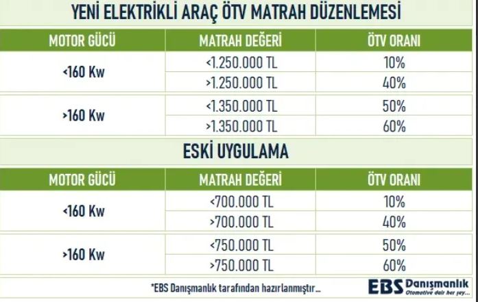 Elektrik motorlu otomobillerin tabi oldukları ÖTV oranına ilişkin matrah yeniden belirlendi. Bu kapsamda motor gücü 160 kW’nın altında olup yüzde 10 ÖTV’ye tabi olan elektrik motorlu araçlar için 700 bin lira olan matrah 1 milyon 250 bin liraya yükseltildi.