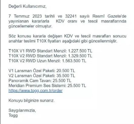 TOGG tarafından geçen hafta modellerine yüzde 27'lik bir artış yapılmıştı.