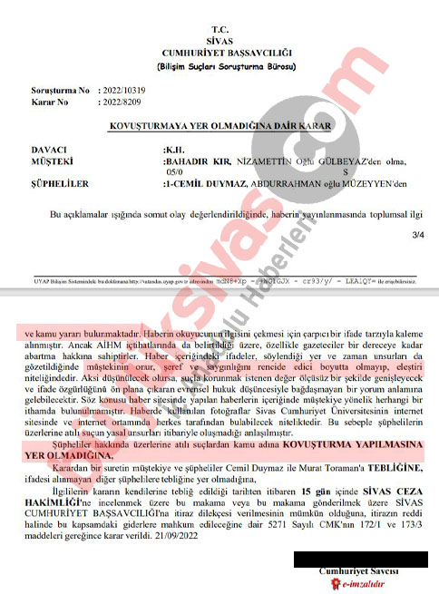 Sürekli buyuksivas.com'u şikayet eden fakat her şikayetleri sonrası yargıdan tokat yiyen yetkililer arasındaki SCÜ Hukuk Müşaviri Bahadır Kır 28.06.2022 tarihinde sitemizde yayınlanan haberler ilgili Yazı İşleri Müdürümüz Cemil Duymaz, editörlerimiz ve konudan tamamen alakasız bir kişi hakkında Savcılığa şikayette bulunmuştu...