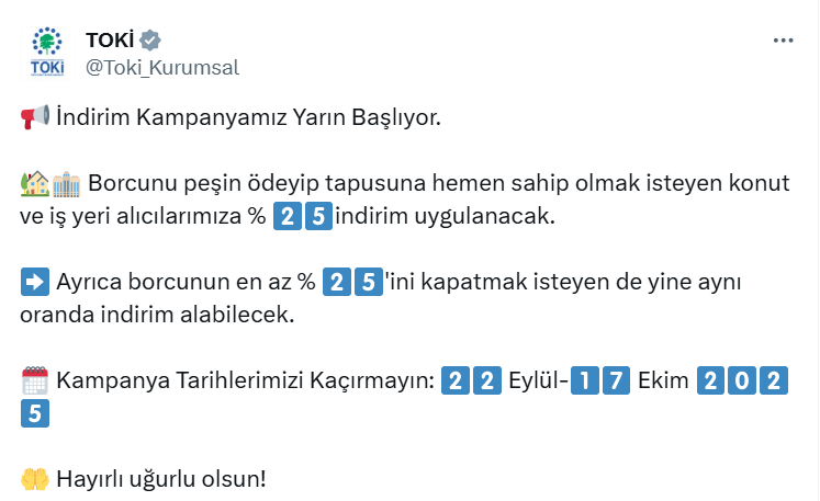 TOKİ, kampanyadan faydalanmak isteyen vatandaşlara “Hayırlı olsun” mesajı verdi.