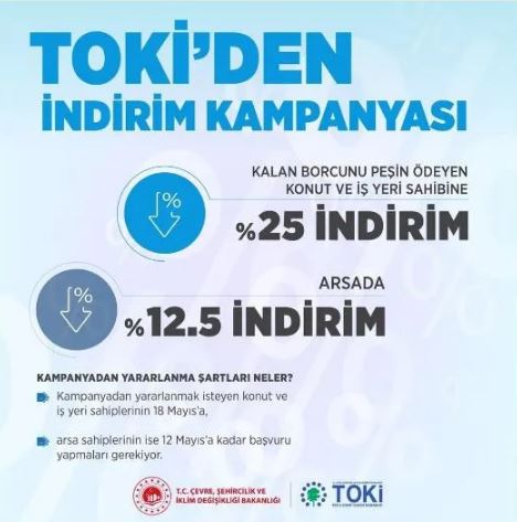 Bakan Murat Kurum, "TOKİ’den konut ve iş yeri sahibi olan vatandaşlarımız kalan borçlarını peşin ödemeleri durumunda yüzde 25 indirim imkânından faydalanacak. Arsalarda da yine peşin ödeyen vatandaşlarımıza, yüzde 12.5 indirim imkanı sağlıyoruz" açıklamasında bulundu.