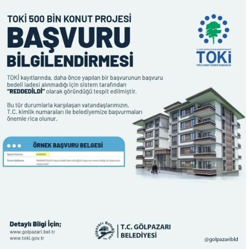 TOKİ’nin 500 Bin Konut Projesi kapsamında başvuru yapan bazı vatandaşların sistemde başvurularının “Reddedildi” olarak görünmesi üzerine Bilecik’in Gölpazarı Belediyesi önemli bir duyuru yaptı.