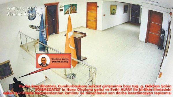 Cumhurbaşkanı Recep Tayyip Erdoğan'a suikast girişiminin başı Tuğgeneral Gökhan Şahin Sönmezateş'in, Hava Harp Okulu'na gelişi ve Tümgeneral Alpay ile birlikte askeri birliklerin komutanlarının katılımıyla birlikte toplantı yaptıkları anlaşılıyor. Suikastçı hainin sırt çantasıyla toplantıya gelmesi dikkat çekiyor. Savcılık, Sönmezateş'in katıldığı toplantının okulda yapılan üçüncü darbe koordinasyon toplantısı olduğu ve Sönmezateş'in suikast emrini bu toplantıda aldığı kaydediliyor.