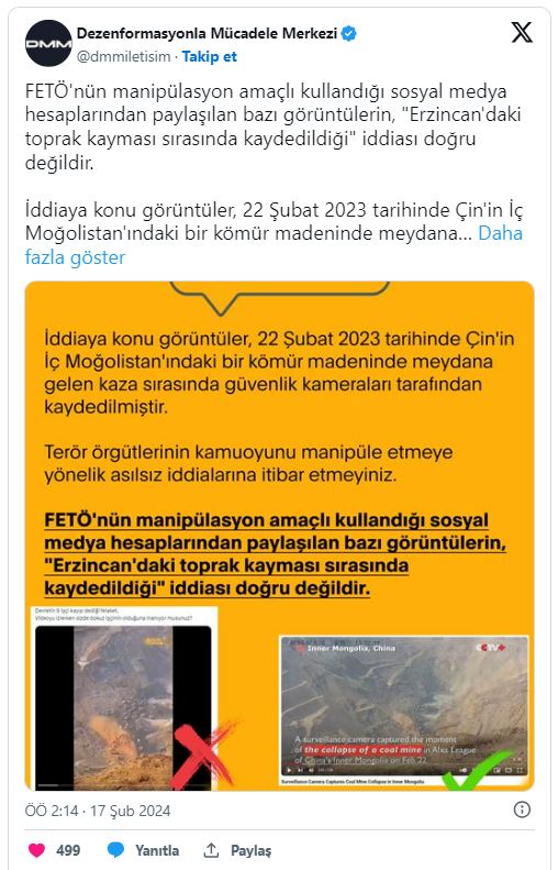 Dezenformasyonla Mücadele Merkezinden yapılan açıklamada, "FETÖ'nün manipülasyon amaçlı kullandığı sosyal medya hesaplarından paylaşılan bazı görüntülerin, 'Erzincan'daki toprak kayması sırasında kaydedildiği' iddiası doğru değildir" denildi.