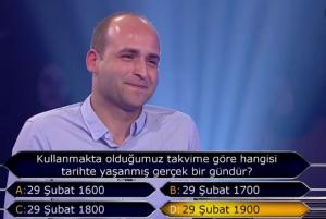 "Kullanmakta olduğumuz takvime göre hangisi tarihte yaşanmış gerçek bir gündür?" sorusuna "29 Şubat 1900" cevabını veren Emre Toraman 250 bin TL'lik ödülü kaybetti.