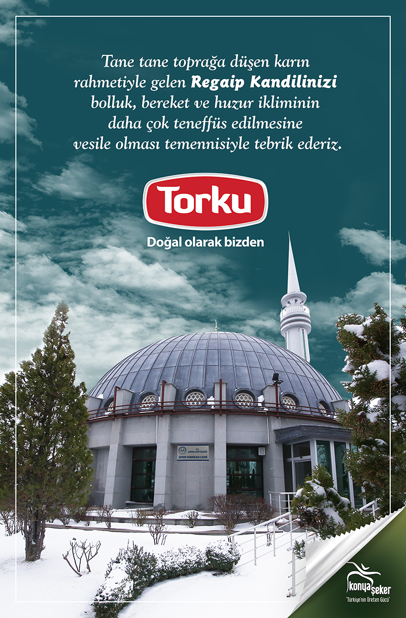 Konya Şeker (TORKU) Regaip Kandili nedeniyle mesaj yayınladı. Yayınlanan mesajda "Tane tane toprağa düşen karın rahmetiyle gelen Regaip Kandilinizi bolluk, bereket ve huzur ikliminin daha çok teneffüs edilmesine vesile olması temennisi ile tebrik ederiz" denildi.