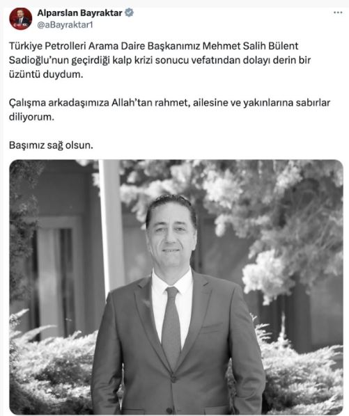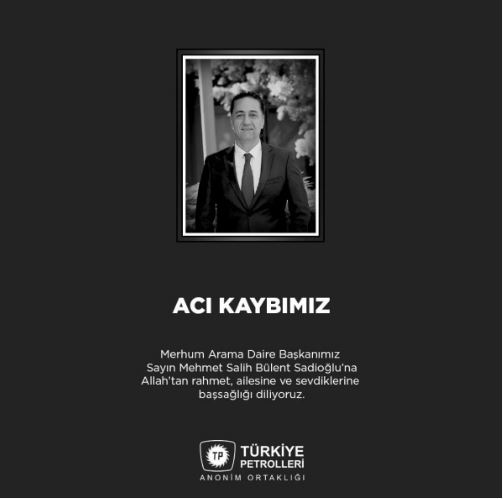 Türkiye Petrolleri Arama Daire Başkanımız Mehmet Salih Bülent Sadioğlu'nun geçirdiği kalp krizi sonucu vefatından dolayı derin bir üzüntü duydum. Çalışma arkadaşımıza Allah'tan rahmet, ailesine ve yakınlarına sabırlar diliyorum. Başımız sağ olsun.