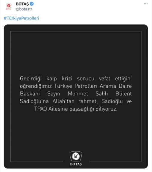 Türkiye Petrolleri Anonim Ortaklığı (TPAO) ise "Acı Kaybımız" diyerek, şu taziye mesajını yayınladı: