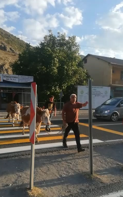 Beldenin karşısındaki meraları kullanmak isteyen vatandaşlar, hayvanlarını geçirecek altgeçit bulunmadığı için çareyi yaya geçidinde buluyor. Nurettin Aydoğdu da ineklerini Gümüşhane-Bayburt karayolundaki yaya geçidinden geçirdi. Araçlar için kırmızı ışık yanınca, sürücülerin şaşkın bakışları arasında hayvanlarıyla karşıdan karşıya geçti.
