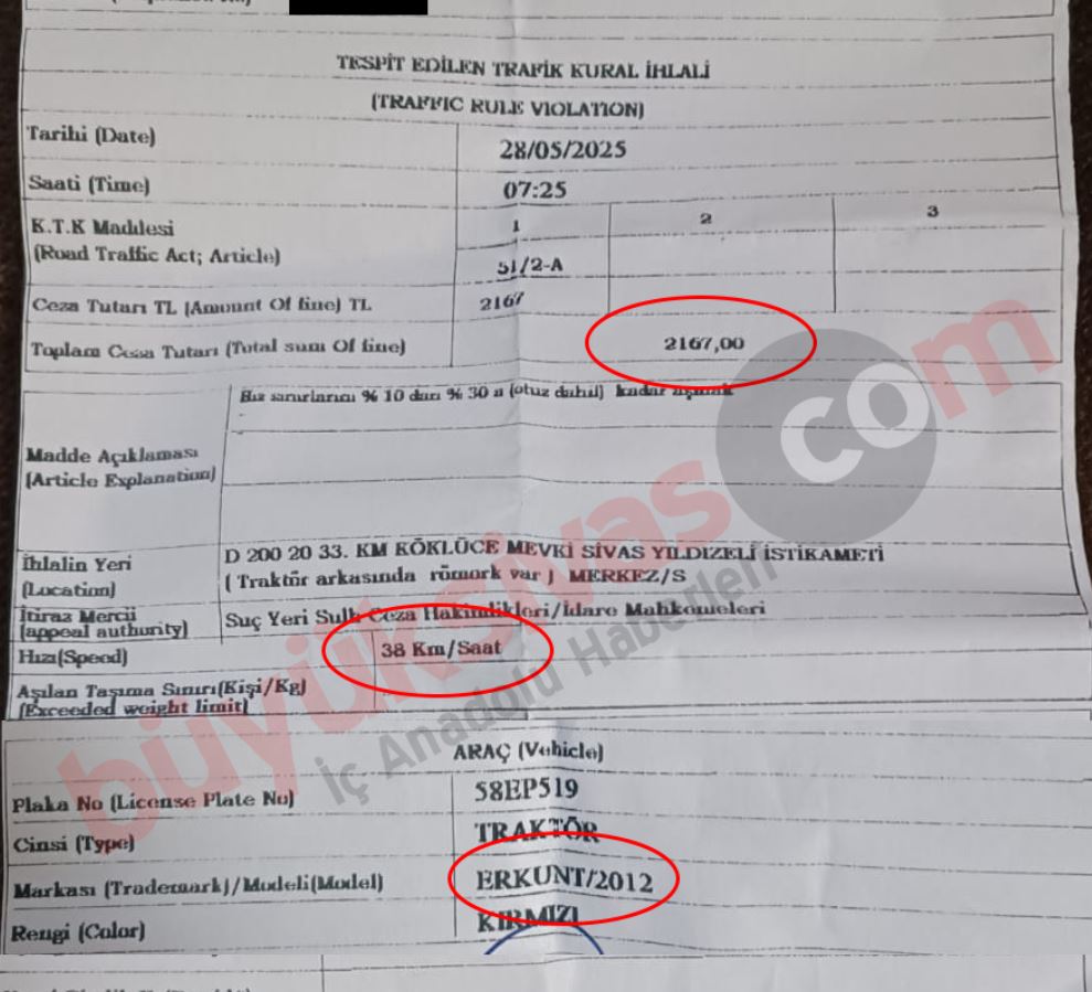 Sivas’ta ilginç bir olay yaşandı. Maksimum hızı 25 kilometre olan Erkunt marka 2012 model bir traktöre, 38 kilometre hızla radar cezası kesildi. Cezayı gören çiftçi, hem şaşkın hem de tepkili.