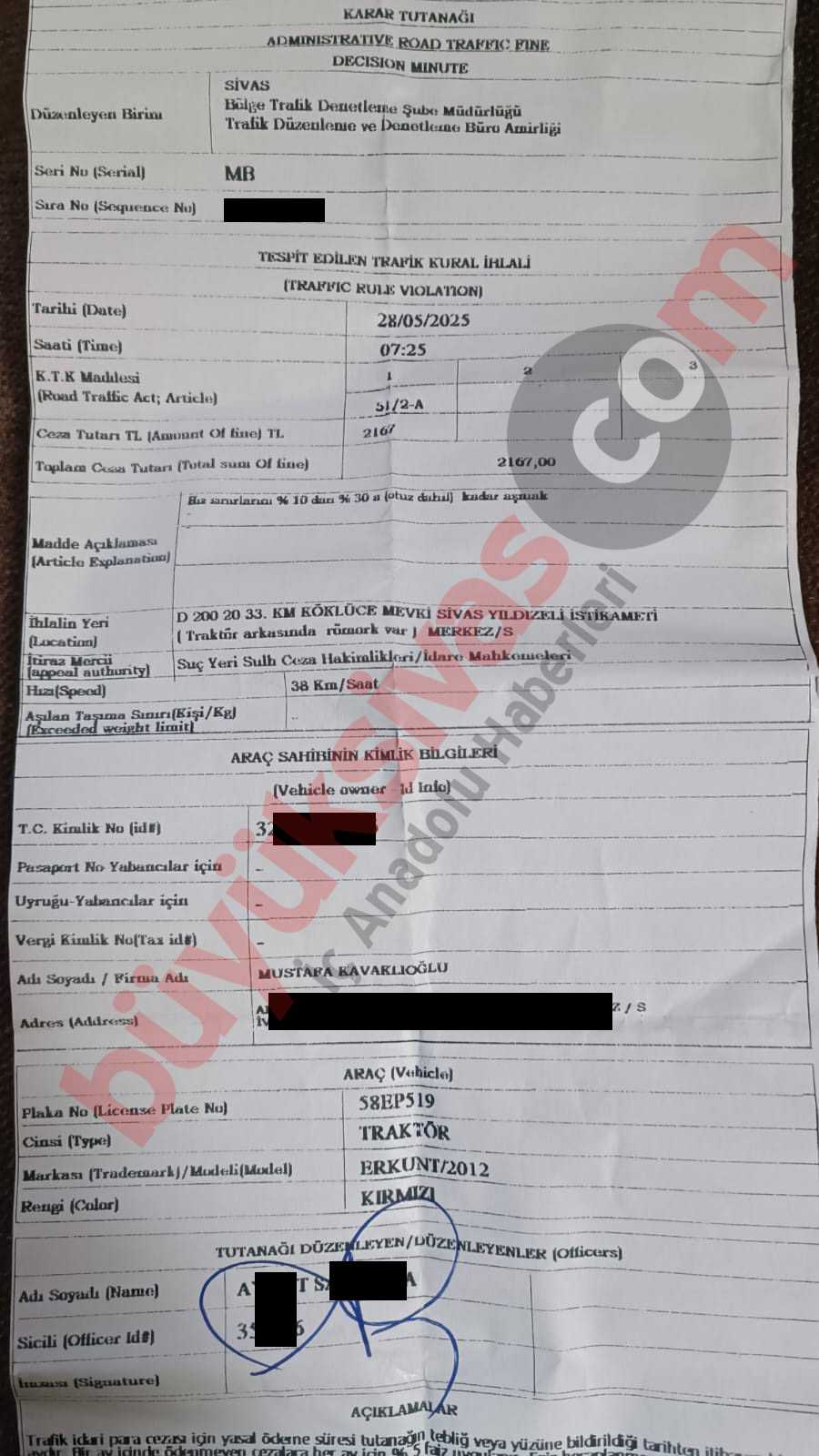 Sivas’ta ilginç bir olay yaşandı. Maksimum hızı 25 kilometre olan Erkunt marka 2012 model bir traktöre, 38 kilometre hızla radar cezası kesildi. Cezayı gören çiftçi, hem şaşkın hem de tepkili.