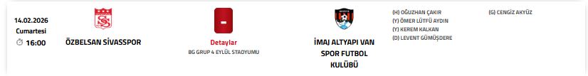 Trendyol 1. Lig 25. Hafta Sivasspor – Vanspor Maçının Hakemi Açıklandı.. Trendyol 1. Lig’in 25. haftasında oynanacak Özbelsan Sivasspor – İmaj Altyapı Vanspor FK karşılaşmasını yönetecek hakem kadrosu Türkiye Futbol Federasyonu tarafından açıklandı. 14 Şubat Cumartesi günü BG Grup 4 Eylül Stadyumu’nda oynanacak mücadele saat 16.00’da başlayacak.