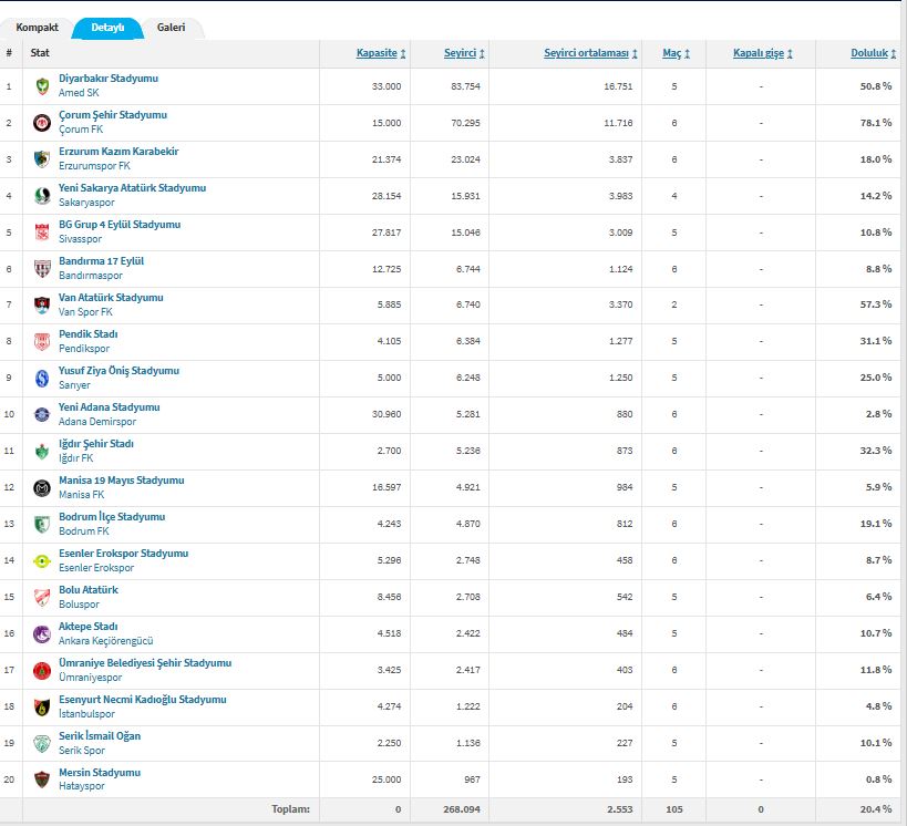Genel tabloya bakıldığında, 20 takımın toplam seyirci sayısı 268 bin 94 olurken, lig genelinde seyirci ortalaması 2.553 olarak belirlendi.
