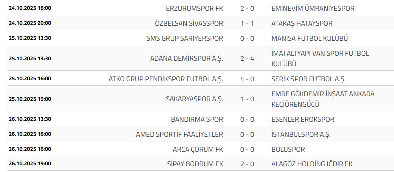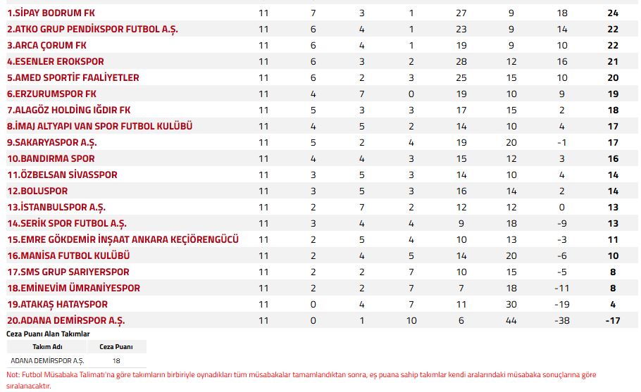 (Genel tabloya göre haftanın diğer karşılaşmalarında lider Sipay Bodrum FK 2-0 kazanarak puanını 24'e çıkarıp zirvedeki yerini korudu.)