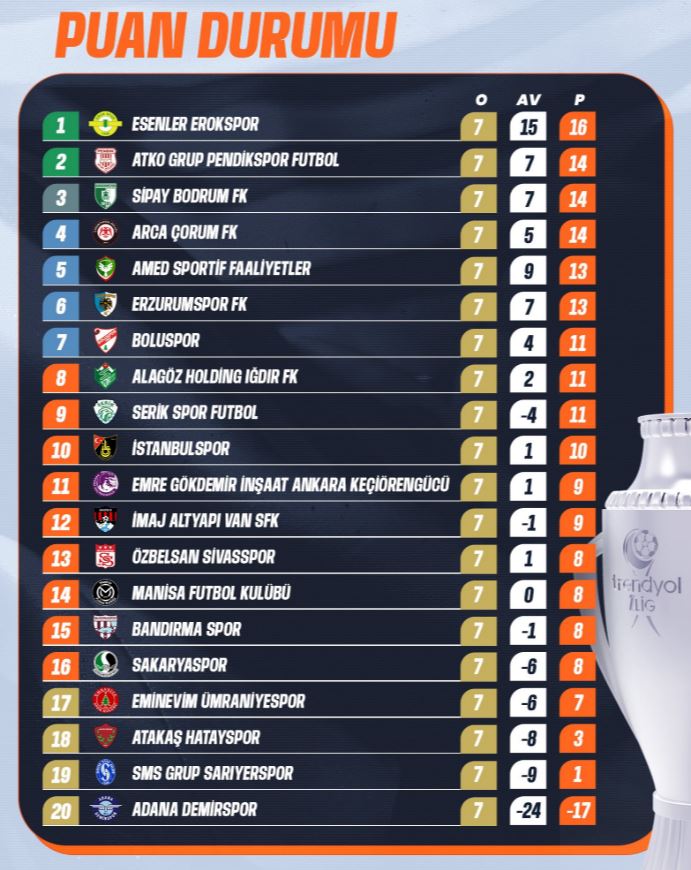 7. hafta sonunda Esenler Erokspor 16 puanla liderliğini sürdürdü. Onu 14’er puanla Atko Grup Pendikspor, Sipay Bodrum FK ve Arça Çorum FK takip etti. Amed Sportif Faaliyetler ve Erzurumspor FK 13’er puanla zirve yarışında iddiasını koruyor.