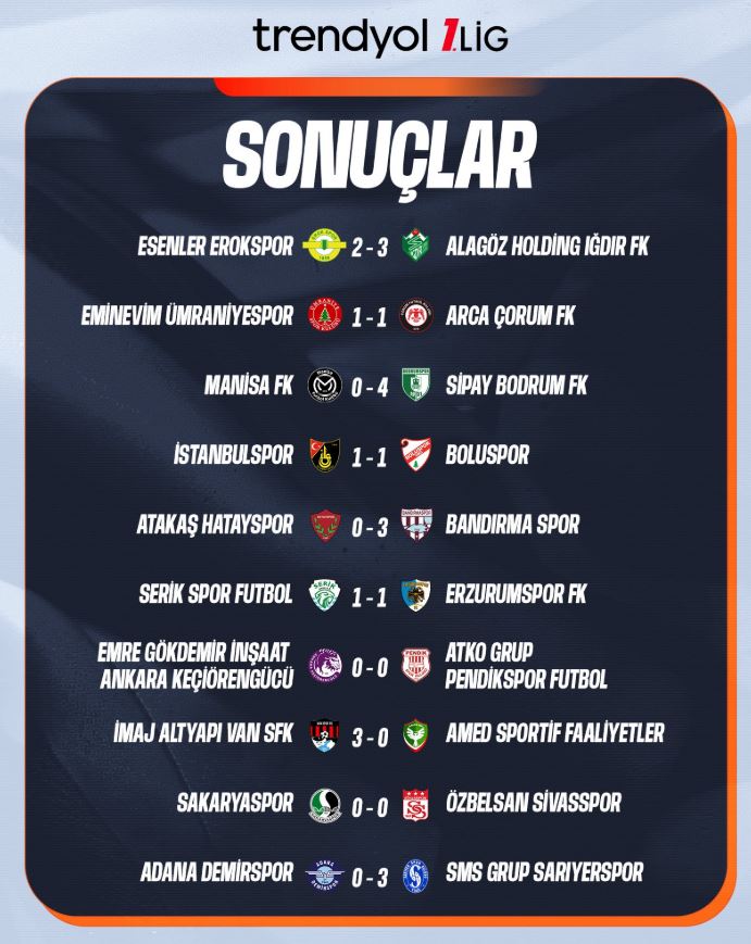 Haftayı galibiyetle kapatan Sipay Bodrum FK, 17 puanla liderliğini sürdürdü. Onu 16 puanla Esenler Erokspor, 15’er puanla Atko Grup Pendikspor Futbol ve Arça Çorum FK takip etti.