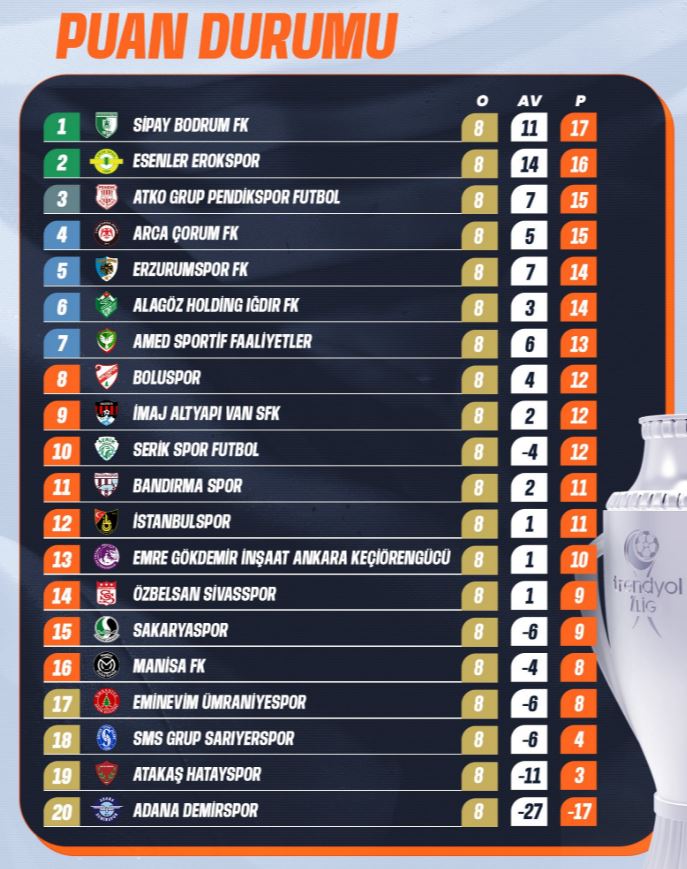 Alt sıralarda ise kötü gidişat devam ediyor. Adana Demirspor 8 haftada aldığı ağır yenilgilerle -27 averajla son sırada yer alırken, Atakaş Hatayspor, SMS Grup Sarıyerspor ve Eminenivim Ümraniyespor düşme hattında bulunuyor.