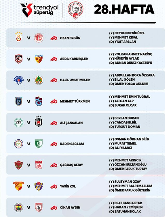 Trendyol Süper Lig'in 28. haftasında görev yapacak hakemler Türkiye Futbol Federasyonu Merkez Hakem Kurulu tarafından açıklandı.