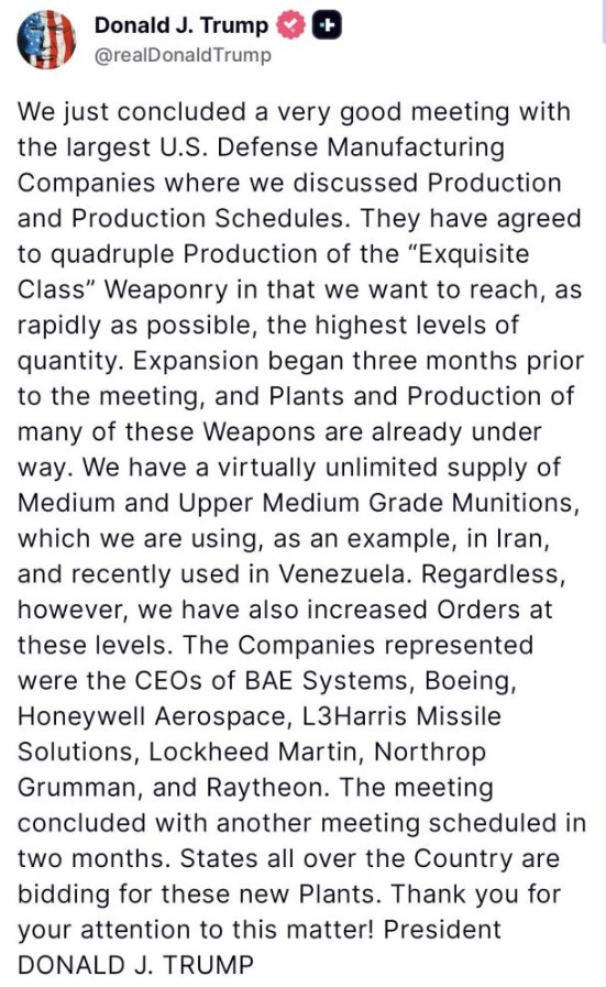 Trump, toplantıya ABD’nin önde gelen savunma sanayii şirketlerinin yöneticilerinin katıldığını belirtti. Görüşmeye BAE Systems, Boeing, Honeywell Aerospace, L3Harris, Lockheed Martin, Northrop Grumman ve Raytheon şirketlerinin yöneticilerinin iştirak ettiği bildirildi.