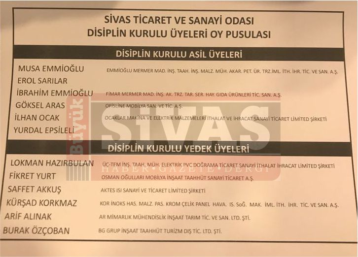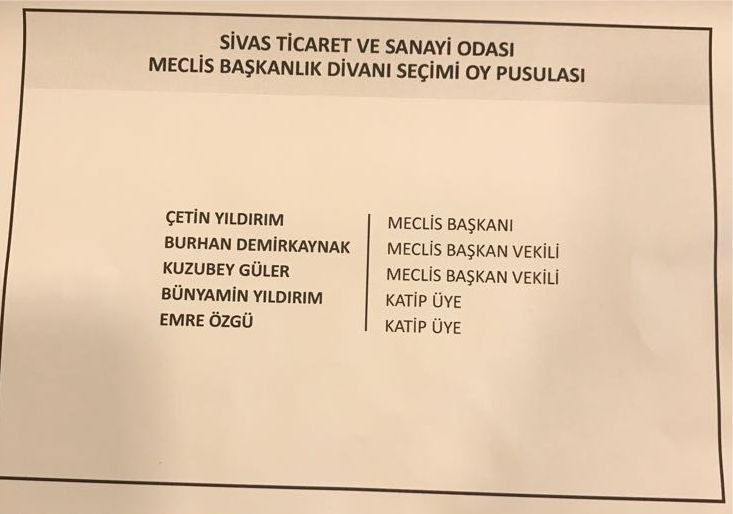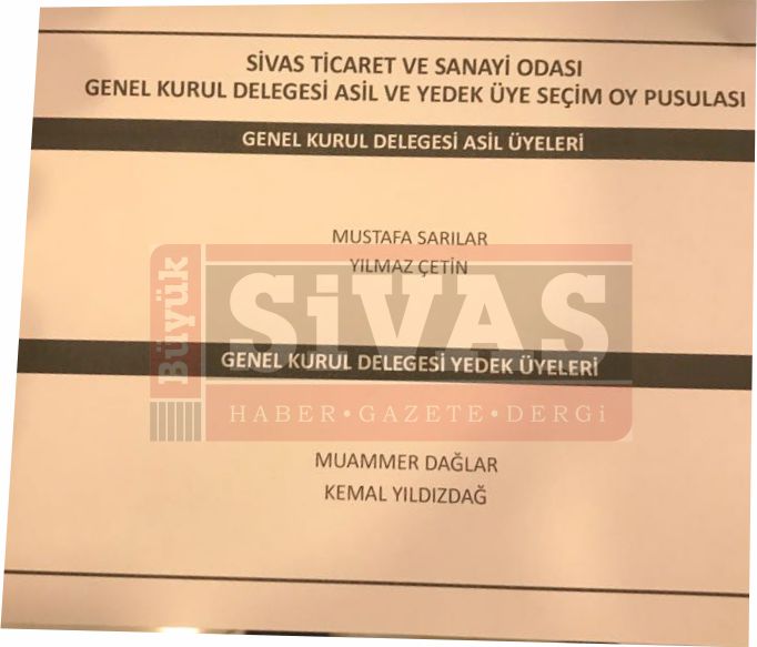 Yapılan Seçimlerde Sivas Ticaret ve Sanayi Odası Yönetim Kurulu Başkanı, Sivas Ticaret ve Sanayi Odası Yönetim Kurulu Üyeleri, Sivas Ticaret ve Sanayi Odası Meclis Başkanlık Divanı, Sivas Ticaret ve Sanayi Odası Disiplin Kurulu Üyeleri, Sivas Ticaret ve Sanayi Odası Genel Kurul Delegeleri seçildi.