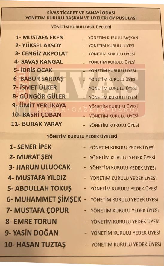 Yapılan Seçimlerde Sivas Ticaret ve Sanayi Odası Yönetim Kurulu Başkanı, Sivas Ticaret ve Sanayi Odası Yönetim Kurulu Üyeleri, Sivas Ticaret ve Sanayi Odası Meclis Başkanlık Divanı, Sivas Ticaret ve Sanayi Odası Disiplin Kurulu Üyeleri, Sivas Ticaret ve Sanayi Odası Genel Kurul Delegeleri seçildi.