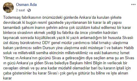 "Tüdemsaş fabrikasının önümüzdeki günlerde Ankara’da kurulan şirkete devrolacak ki bugün resmî gazetede yayınlananan bir kararla alt yapısı tamamladı şahsım inanın şehrim adına çok üzüldüm kabul edilemez bir karar binlerce sivaslının ekmek yediği bu fabrika da önce yönetim kadroları taşınacak sonrada küçültülecek yazık ki yazık anlamadığım bir hususta Sivaslı üst düzey bürokratımız DDY genel müdür yardımcısı bilal tırnakçı ulaştırma bakan yardımcısı selim Dursun yine ulaştırma eski müsteşarı ve bakanı Habib soluk ve milletvekili semiha ekincinin milletvekilimiz ve eski bakanımız İsmet Yilmaz ın Ankara’nın gücünü Sivas a getireceğim diye seçilen ama şu an Sivas ın gücü Ankara’ya giden Sivas belediye Başkanı hilmi Bilgin in verilecek bir cevapları olmalı ve şu ana kadar müdahil olamadılar bari bu kararın iptali için çaba göstersinler bu karar Sivas’ı çok geriye götürür bu biline ve işte alınan karar"