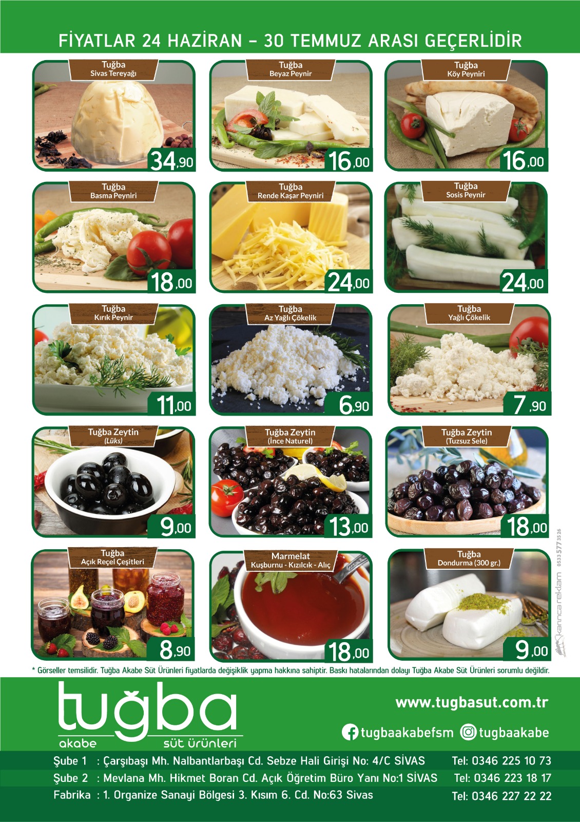 Tuğba Akabe Süt Ürünleri yönetim kurulu üyesi Mustafa Cemal Er bir açıklama yaparak “Fabrikamızda el değmeden üretilen ürünlerimize özellikle yurt dışından ciddi talepler geldi ve ihracatçı bir firma olduk. Ürünlerimizi iç pazarda da yaygınlaştırmak istiyoruz. Hem Sivaslı tüketicilerimize hem de il dışında yaşayan Sivaslılara ürünlerimizi daha uygun fiyata alma imkanı sağladık ve 15 ürünümüzde indirim uyguladığımız bir kampanya başlattık. 30 Temmuza kadar sürecek bir kampanyada ürünlerimizi almak isteyen tüketicilerimiz gerek sosyal medya hesaplarımızdan gerekse 0346 227 22 22 no'lu telefonumuza ulaşarak sipariş verebilirler.