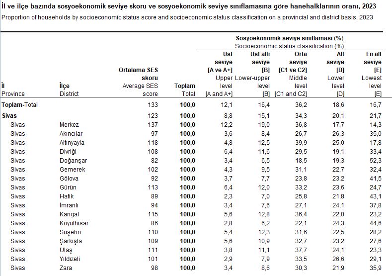 - Sivas Merkez ortalama 137 SES skoru ile Türkiye ortalamasına en yakın ilçe olurken, hanelerin %12,2’si üst seviyede, %14,7’si en alt seviyede yer aldı.
