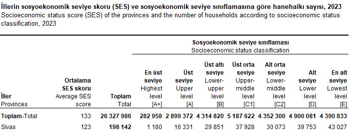 Verilere göre Sivas’ın ortalama SES skoru 123 olurken, bu oran Türkiye ortalaması olan 133’ün altında kaldı. Kentteki 198 bin 142 hanenin yalnızca %8,8’i üst seviyede yer alıyor. Buna karşılık hanelerin %21,7’si en alt seviyede, %20,1’i alt seviyede, %38,7’si orta seviyede, %15,1’i üst alt seviyede bulunuyor.