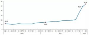2022 yılı Şubat ayında bir önceki aya göre %4,81, bir önceki yılın Aralık ayına göre %16,45, bir önceki yılın aynı ayına göre %54,44 ve on iki aylık ortalamalara göre %25,98 artış gerçekleşti.haber7