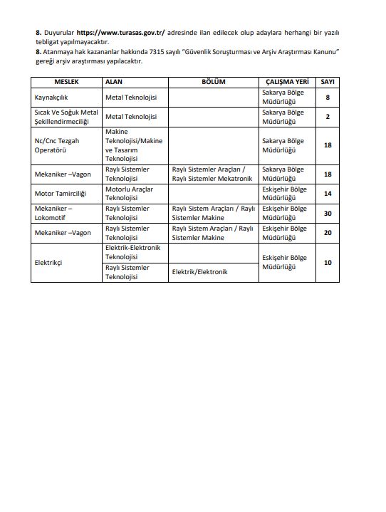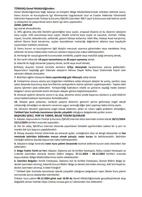 Türasaş Genel Müdürlüğü tarafından yapılan açıklamada: " Genel Müdürlüğümüze bağlı Sakarya ve Eskişehir Bölge Müdürlüklerimizde istihdam edilmek üzere, Kamu Kurum ve Kuruluşlarına İşçi Alınmasında Uygulanacak Usul ve Esaslar Hakkında Yönetmelik hükümleri kapsamında Türkiye İş Kurumu (İŞKUR) üzerinden 4857 sayılı İş Kanununa tabi belirsiz süreli iş sözleşmesi ile çalıştırılmak üzere daimi işçi alımı yapılacaktır." ifadelerine yer verildi.