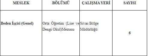 6.Genel Müdürlüğümüze bağlı Sivas Bölge Müdürlüğümüzün ihtiyaç duyduğu hizmet türlerinde/mesleklerinde alımların Sivas ili ve ilçelerinde ikamet edenler karşılanması yoluna gidilecektir. Başvurularda, kişilerin Adrese Dayalı Nüfus Kayıt Sisteminde kayıtlı olan adresleri dikkate alınacaktır.