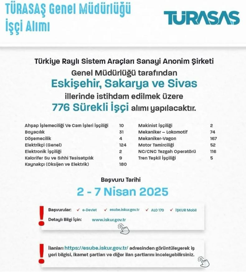 Türkiye Raylı Sistem Araçları Sanayi Anonim Şirketi (TÜRASAŞ) Genel Müdürlüğü tarafından Eskişehir, Sakarya ve Sivas illerinde istihdam edilmek üzere toplam 776 sürekli işçi alımı yapılacağı duyurulmuştu.