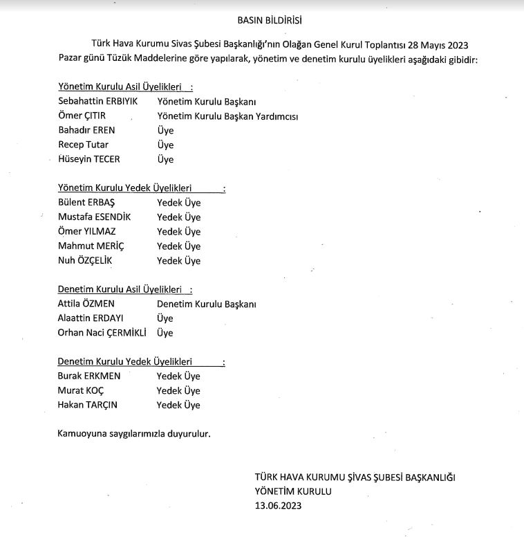 Türk Hava Kurumu Sivas Şubesinde Yönetim ve Denetim Kurulu Üyeleri Belli Oldu!