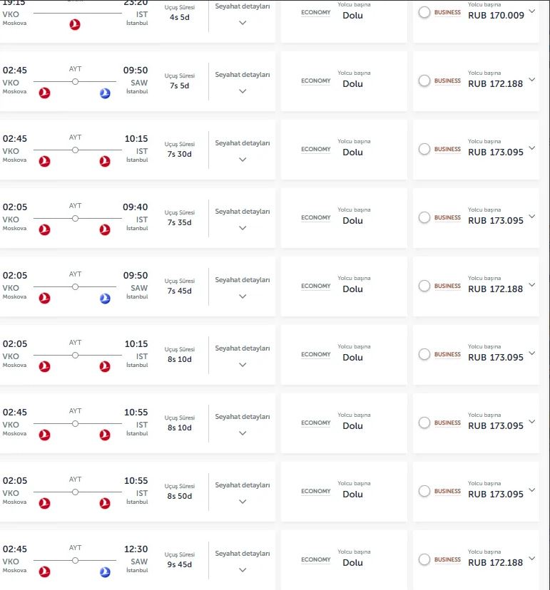 Moskova’dan İstanbul’a bugün ve yarın (21-22 Eylül) yapılacak uçuşların biletlerinin tamamı tükendi. Bilet bulunabilen en yakın tarihli uçuş Cuma (23 Eylül) günü. Ortalama 30 bin ruble (9 bin TL) olan bilet fiyatları ise şu anda 173 bin rubleyi (51.900 bin TL) aşmış durumda.