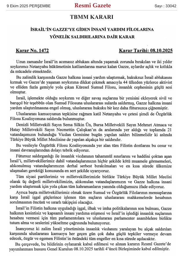 Türkiye Büyük Millet Meclisi (TBMM), İsrail’in Gazze’ye insani yardım götüren Küresel Sumud Filo’suna yönelik saldırısını kınayan kararı Resmî Gazete’de yayımladı.