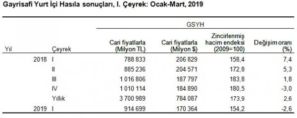 TÜİK verilerine göre; Gayrisafi Yurt İçi Hasıla birinci çeyrek ilk tahmini; zincirlenmiş hacim endeksi olarak (2009=100), 2019 yılının birinci çeyreğinde bir önceki yılın aynı çeyreğine göre yüzde 2,6 azaldı.