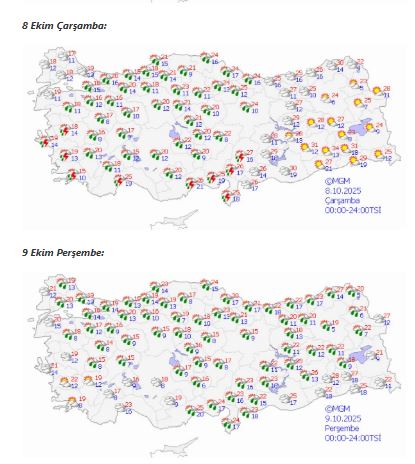 Buna göre, özellikle 9 Ekim Perşembe günü yurdun neredeyse tamamında sağanak ve gök gürültülü yağışlar etkili olacak. Kuvvetli yağışlarla birlikte sel ve su baskını riskine dikkat çekildi.