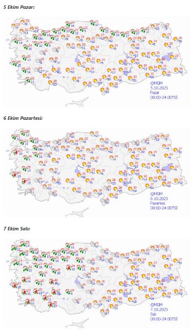 Pazartesi ve salı günleri Marmara, Ege, Batı Akdeniz, İç Anadolu’nun kuzeybatısı ve Karadeniz’de sağanak ve gök gürültülü sağanak yağışların etkili olması öngörülüyor. MGM, özellikle Marmara’nın doğusu, Batı ve Orta Karadeniz, Aydın, Afyonkarahisar, Kırıkkale, Yozgat ve Ankara’nın güneyinde kuvvetli yağış uyarısı yaptı. Vatandaşların sel, su baskını ve yıldırım riskine karşı dikkatli olmaları gerektiği vurgulandı.