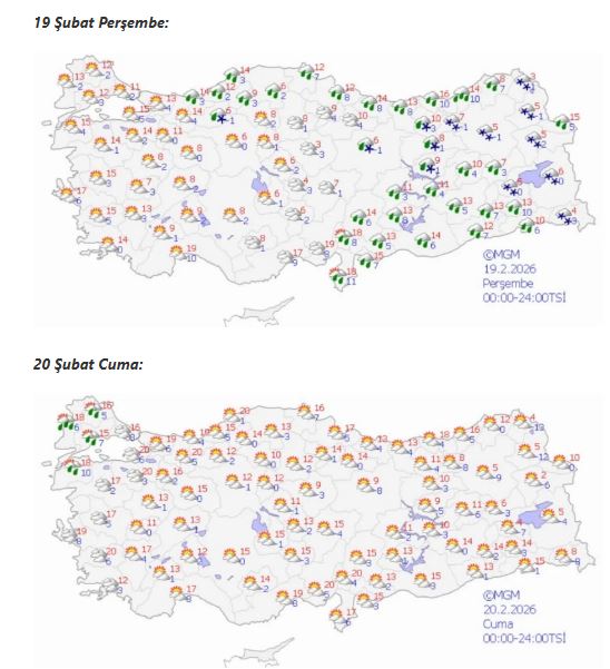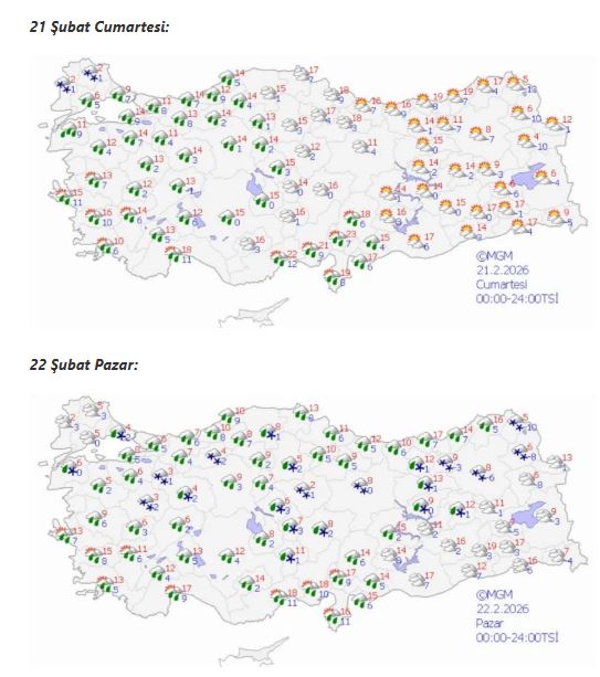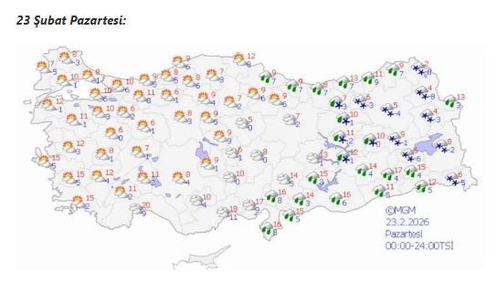 Haftanın ilk günü olan pazartesi günü ise doğu kesimlerde yağışlı havanın devam etmesi, batı bölgelerde daha açık bir hava görülmesi tahmin ediliyor. Sıcaklıkların genel olarak düşük seviyelerde seyredeceği ve özellikle iç ile doğu kesimlerde gece sıcaklıklarının sıfırın altına düşebileceği ifade ediliyor.